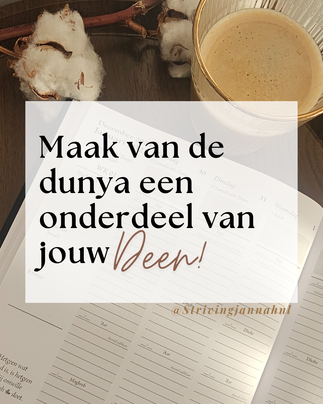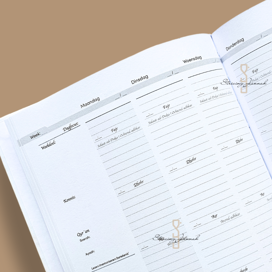 Wil jij werken aan een betere versie van jezelf? Als moslim en als mens? Werken aan je persoonlijke doelen en van de Dunya een onderdeel van jouw Deen maken? Met de 𝙎𝙩𝙧𝙞𝙫𝙞𝙣𝙜 𝙅𝙖𝙣𝙣𝙖𝙝 𝙥𝙡𝙖𝙣𝙣𝙚𝙧 werk jij aan jouw ambities in het hiernamaals en ambities in deze wereld. Middels reflecties, doelen en Islamitisch timemanagement!