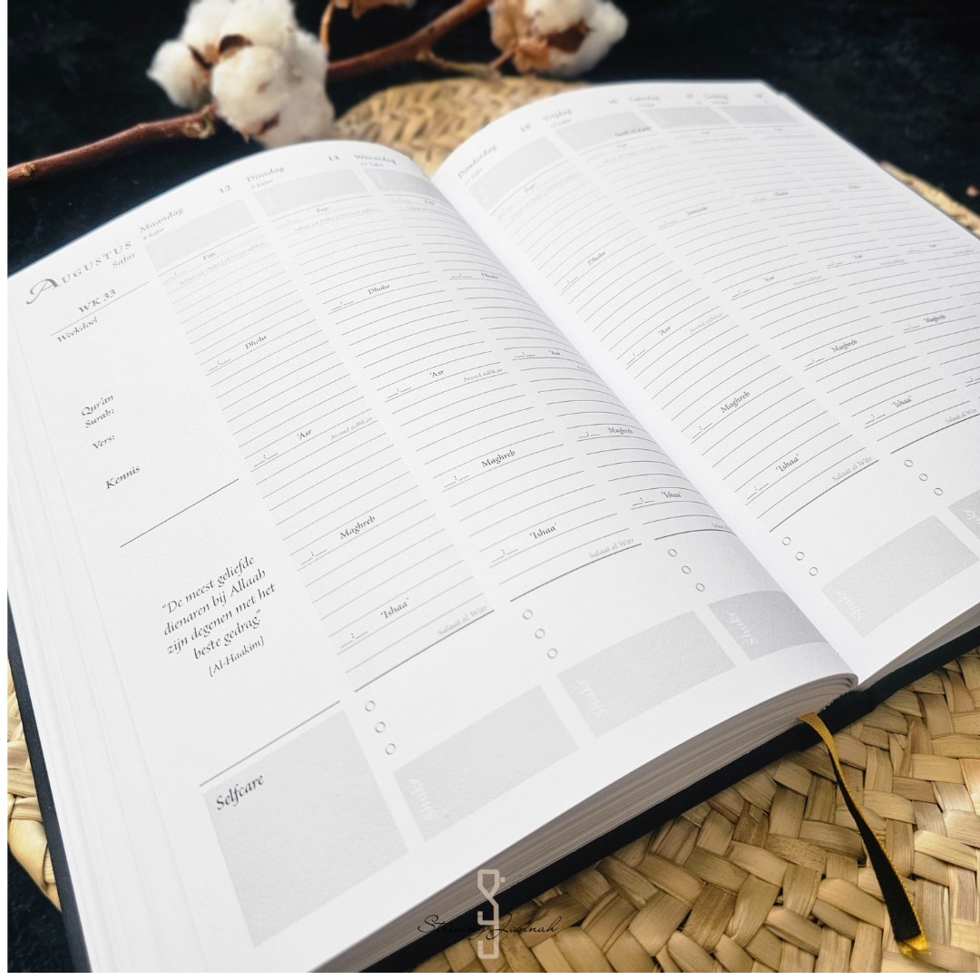 De planner is zo ontwikkeld, dat jij van het wereldse een onderdeel maakt van de Deen. Hoe? Door omwille van Allaah jouw leven in te richten naar gelang Zijn Tevredenheid en doelgericht en gedisciplineerd aan de slag te gaan met jouw leven! Door jouw wereldse ambities in dienst te laten zijn van jouw einddoel; Jannah.